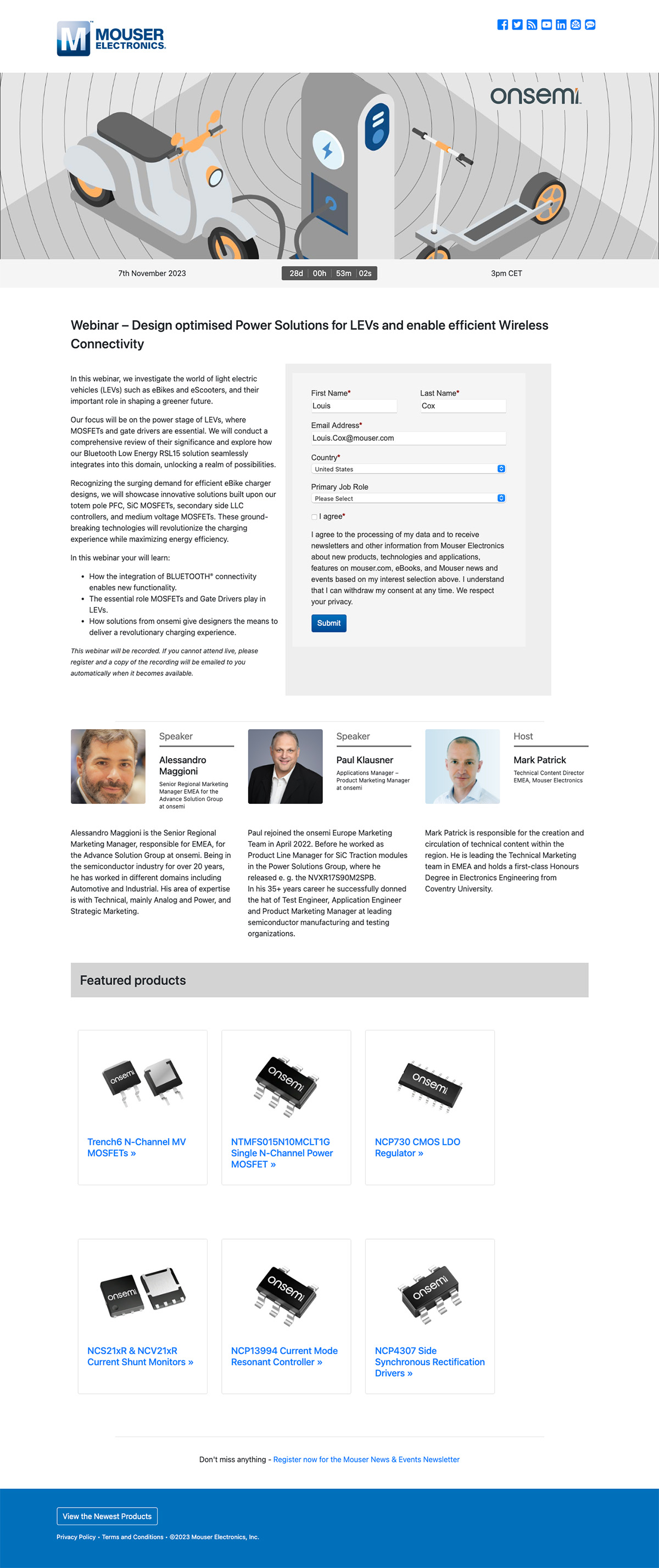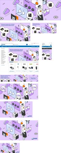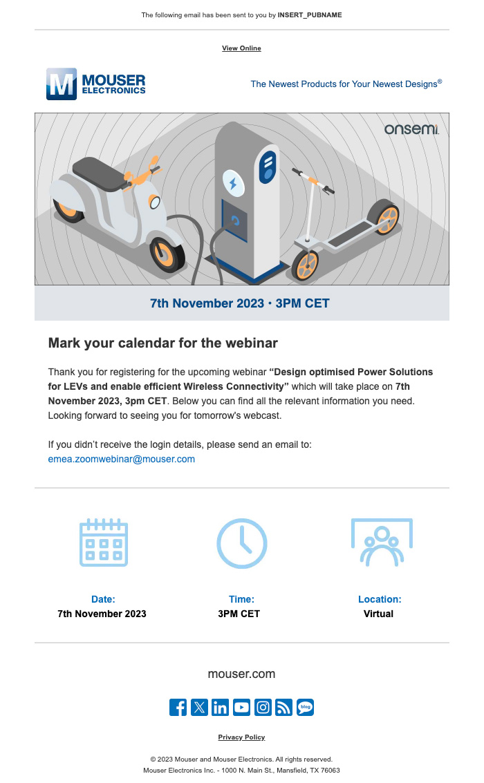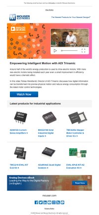 Design layouts for campaigns incorporating the repeated use of a single campaign design and used in order, Web page main image, Mouser site carousel images, in situ view of those images, email banner and hero image, social images. Created in Illustrator.